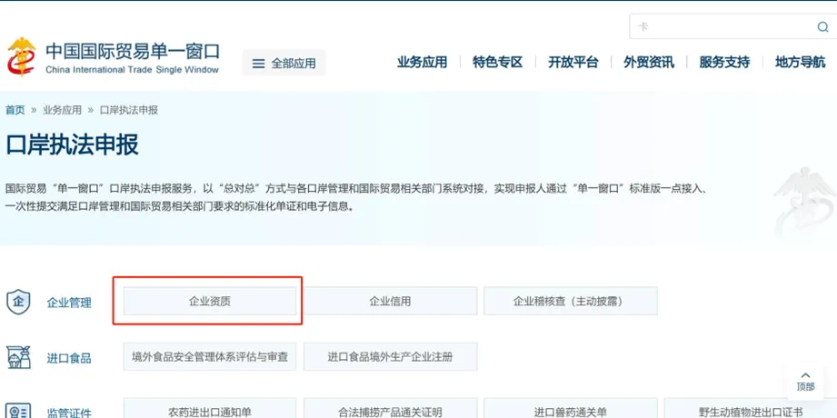 企业登录成功后,返回首页,依次点击:“业务应用—口岸执法申报—企业管理—企业资质”访问。