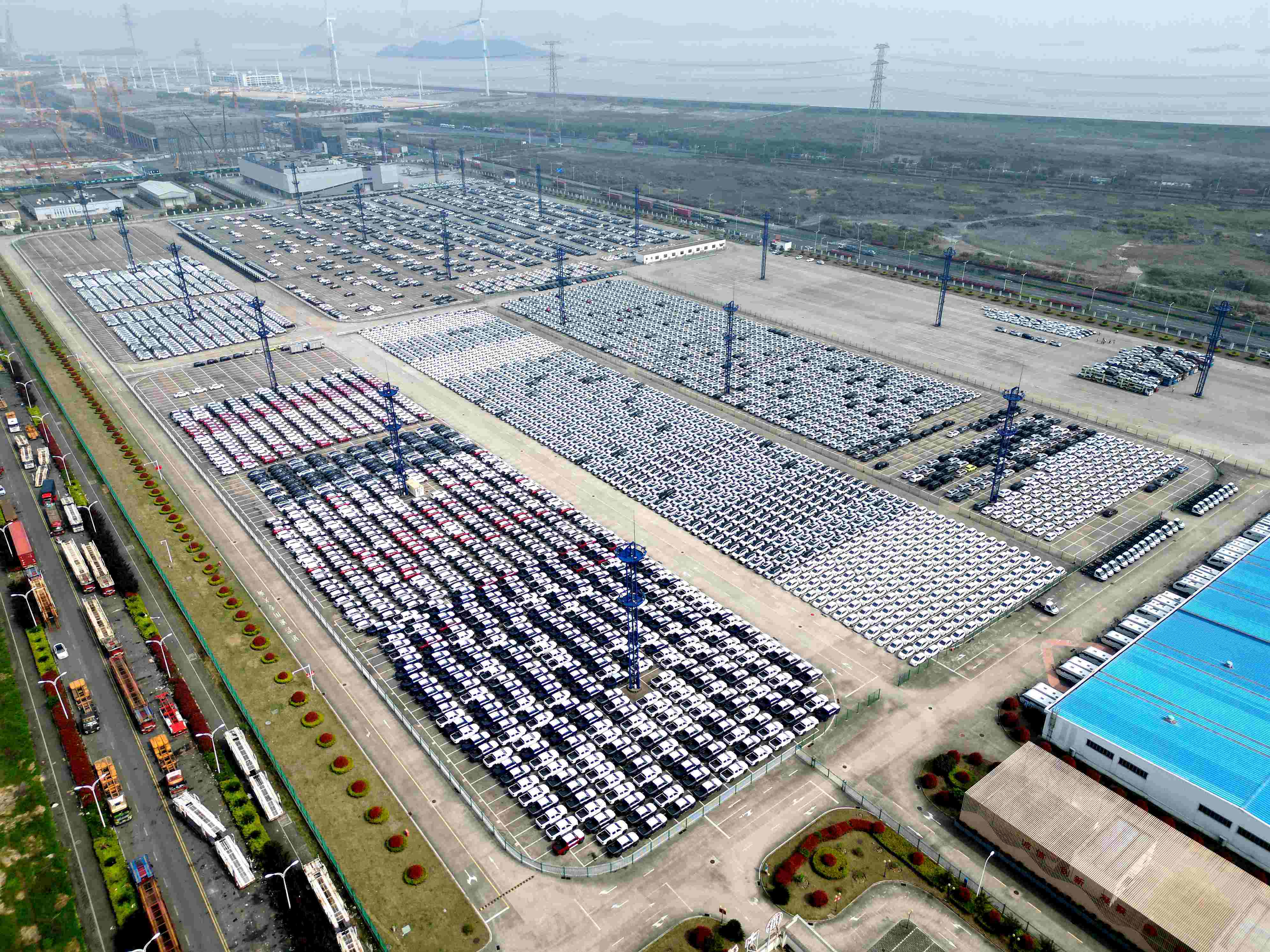 新能源汽车整齐排列停放在中信港通汽车堆场内等待装运出口