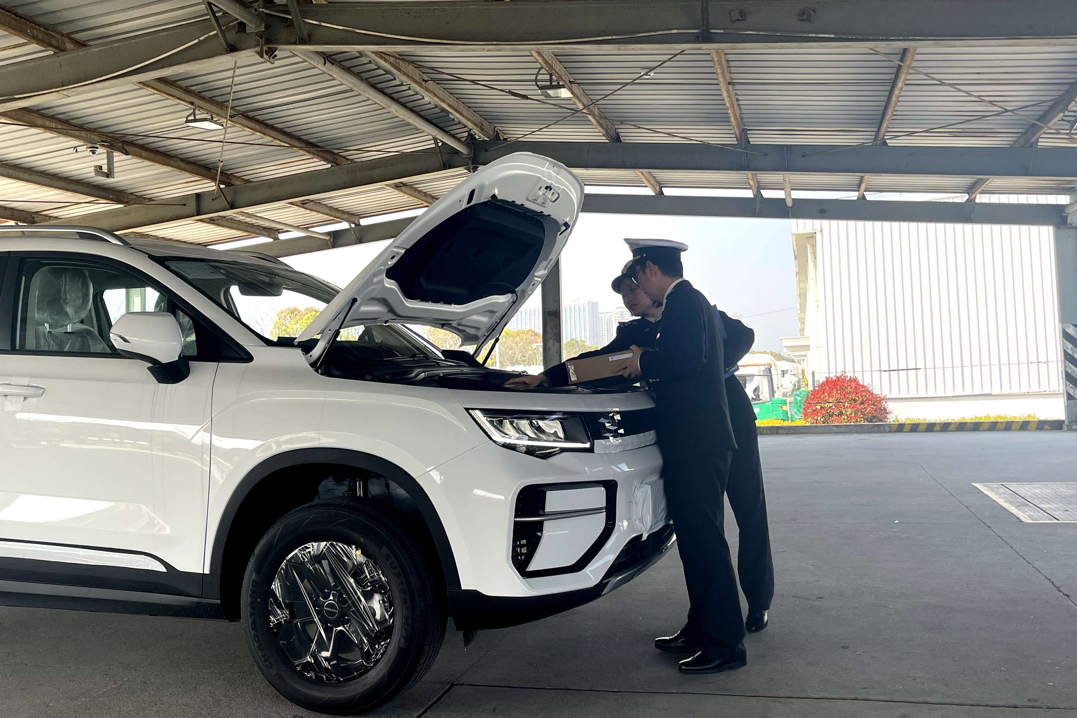 梅山海关关员对集装箱出口的新能源汽车进行现场监管