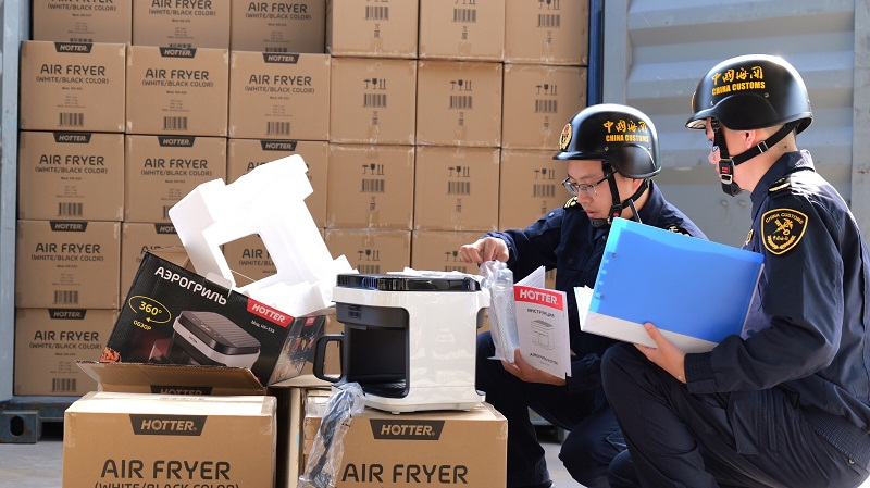 Photo: Customs officers conduct on-site inspection of air fryers exported via China-Europe Railway Express. Photo by Xu Hui