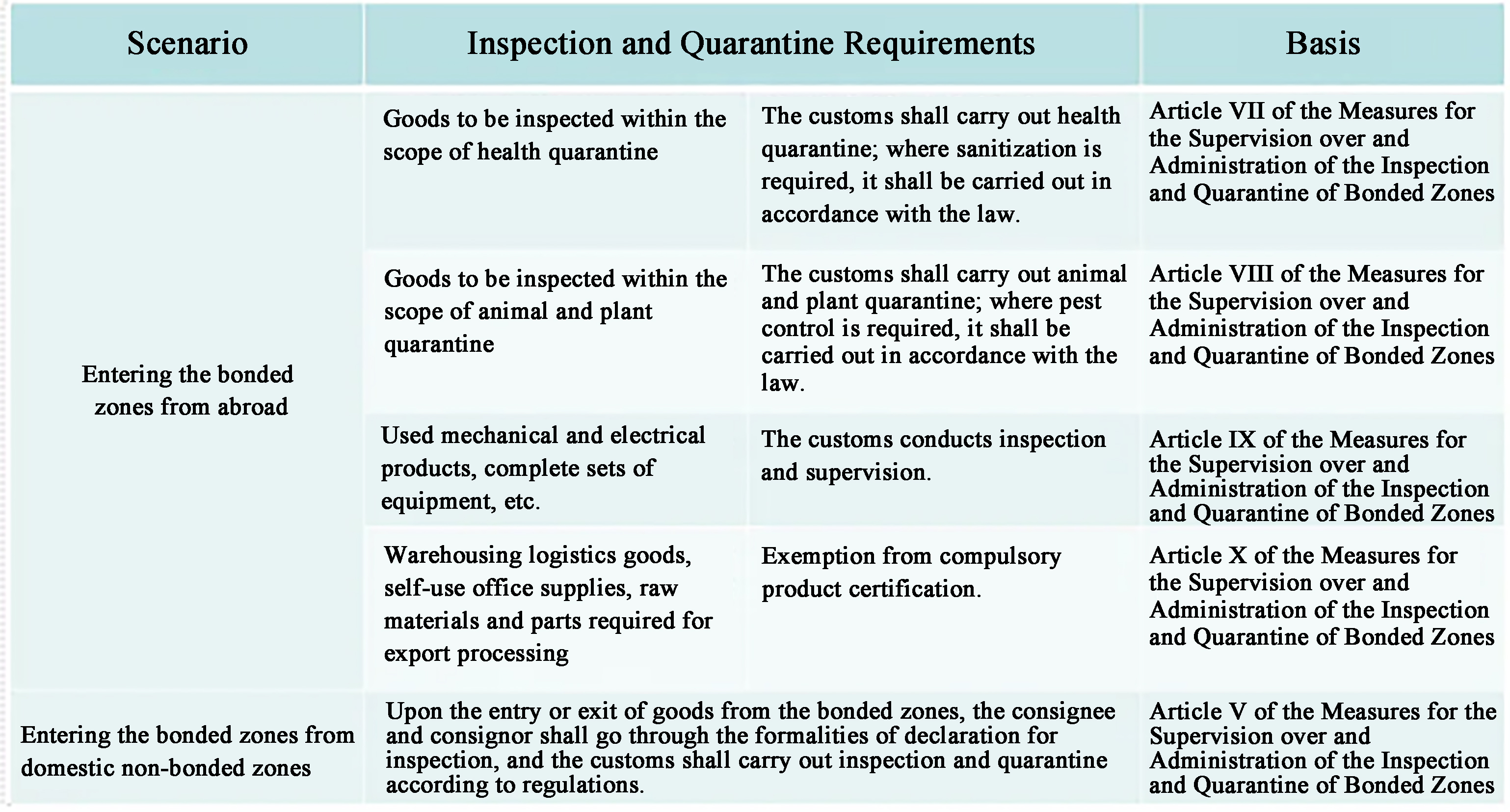 Have you got the inspection and quarantine requirements for goods subject to inspection when entering and exiting the bonded zones?