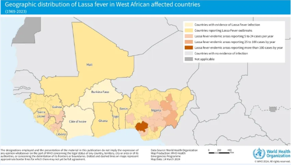拉沙热是由拉沙热病毒引起,主要经啮齿类动物传播的一种急性动物源性传染病。因首例于1969年在尼日利亚东北地区的拉沙镇发现而得名,此后扩散至利比里亚、塞拉利昂等非洲国家。宿主主要为多乳鼠等啮齿类动物,其感染后不会发病,但可通过尿液和粪便排泄病毒。目前主要在西非地区流行,重点国家为尼日利亚、利比里亚、塞拉利昂、几内亚等。每年约有30—50万拉沙热病例,死亡达5000例。