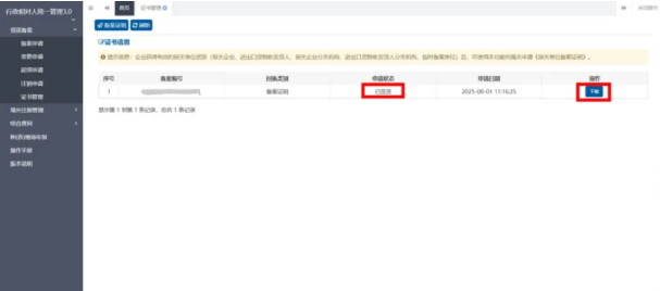 (五)申请状态变为“已签发”,点击操作下方的“下载”按钮,即可得到新版《报关单位备案证明》。