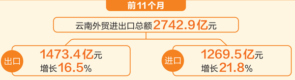 昆明海关12月17日通报,今年前11个月,云南外贸进出口总额2742.9亿元,较上年同期增长18.9%。其中,出口1473.4亿元,增长16.5%;进口1269.5亿元,增长21.8%。