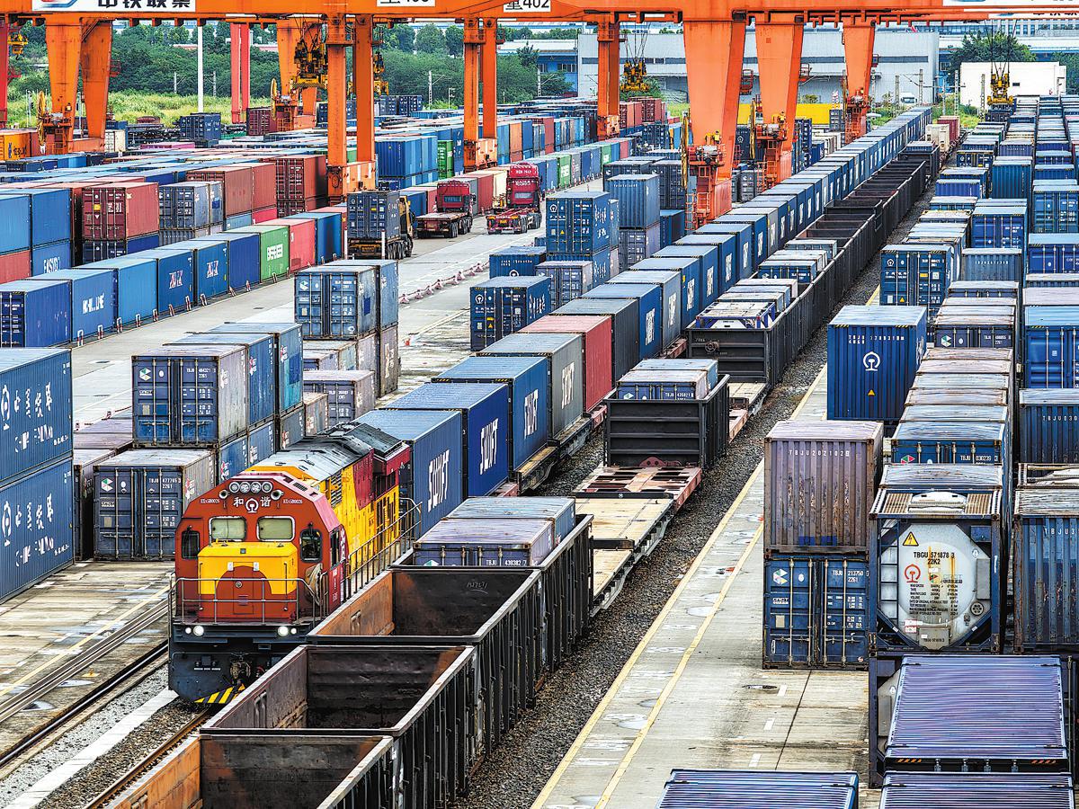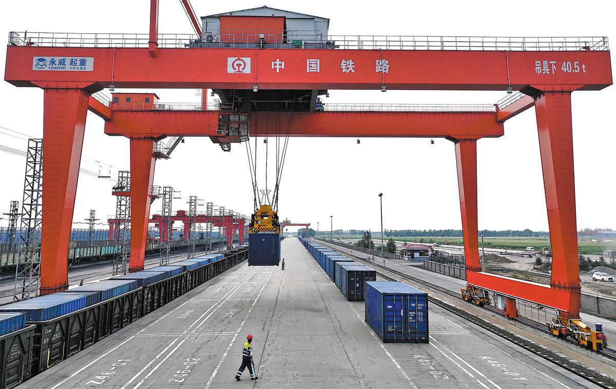 Containers for the China-Europe Railway Express service are hoisted in Tongjiang, Heilongjiang province, on July 25. The station, near the China-Russia border, serves as a transfer hub for trains of different gauges in China and Russia. WU YUNAN/XINHUA