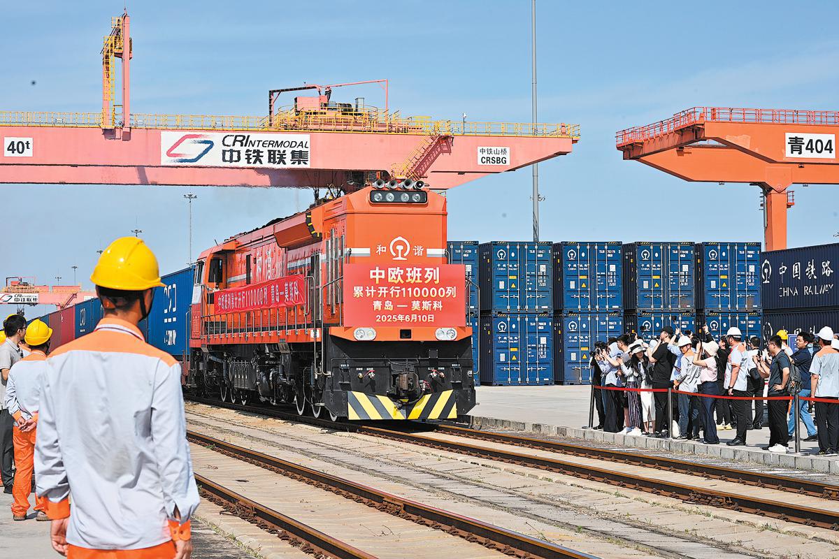 The 110,000th train of the China-Europe Railway Express service departs from Qingdao, Shandong province, in June. YIN DONGXUN/XINHUA