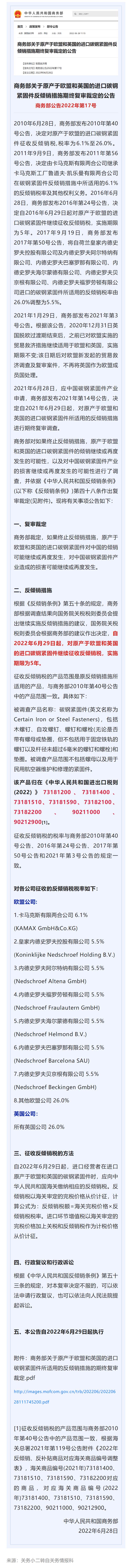 商务部:继续对原产于欧盟和英国的进口碳钢紧固件实施反倾销,为期5年