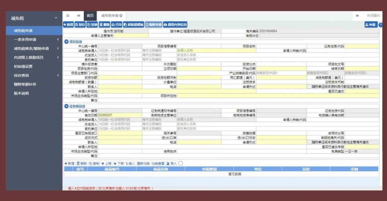 以“中国国际贸易单一窗口”为例,进入“减免税申请”模块,界面如下图所示,其中,黄色背景字段为必填项,白色背景字段为选填项,灰色背景字段不能直接填写(由系统自动调用填写)。填报完毕后点击“申报”即可。