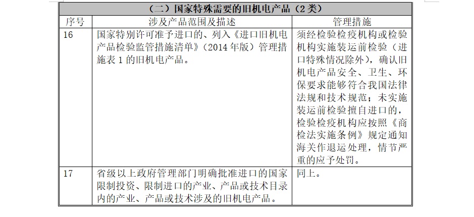 1.《质检总局关于调整进口旧机电产品检验监管的公告》(2014年第145号),对于列入《进口旧机电产品检验监管措施清单》管理措施表2的旧机电产品应实施装运前检验,共计17类旧机电产品。
