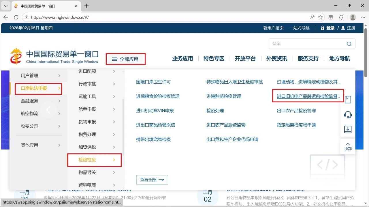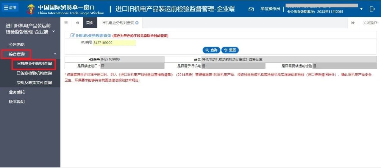 2.通过“中国国际贸易单一窗口”—全部应用—口岸执法申报—检验检疫—进口旧机电产品装运前检验监督管理系统—委托企业入口—综合查询—旧机电业务规则查询,在模块页面中输入产品的HS编码,即可查询相关商品是否需要装运前检验。
