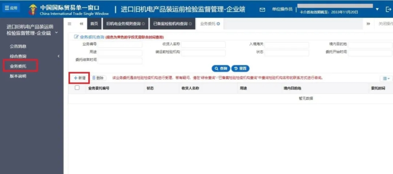 进入“中国国际贸易单一窗口”-全部应用—口岸执法申报-检验检疫-进口旧机电产品装运前检验监督管理-委托企业入口-业务管理-业务委托,点击“新增”按钮,进入“新增业务委托界面”,其中必填项以红色*标出。
