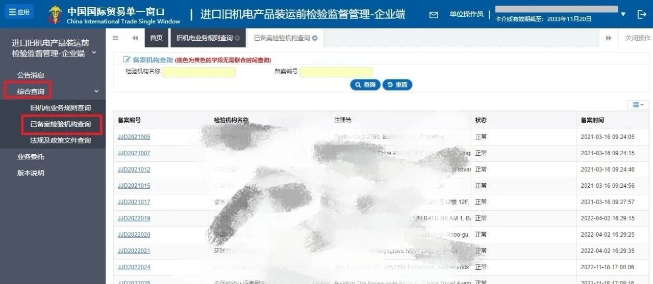通过“中国国际贸易单一窗口”—全部应用—口岸执法申报—检验检疫—进口旧机电产品装运前检验监督管理系统—委托企业入口——综合查询——已备案检验机构查询。