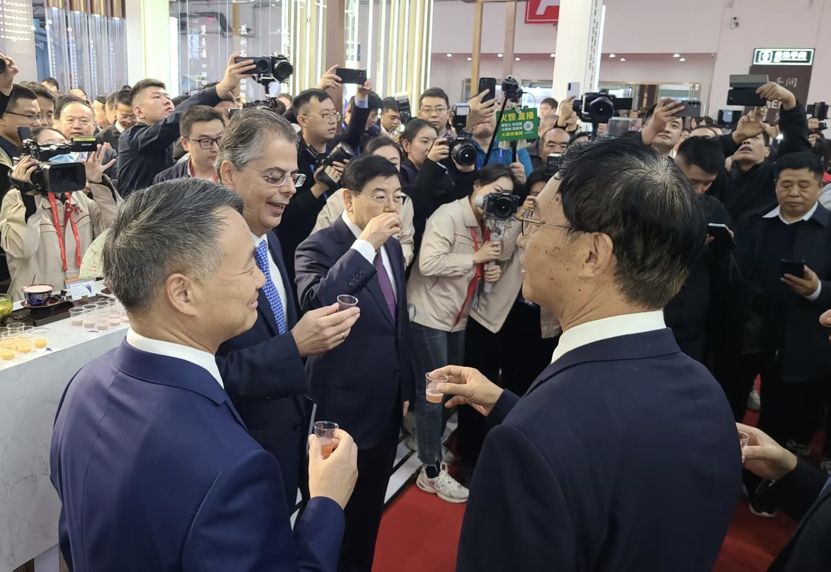 Greece's Ambassador to China Evgenios Kalpyris (second from left) introduces Greek wine to guests at the China Xinghuacun International Alcoholic Drinks Expo 2025. [Photo provided to chinadaily.com.cn]