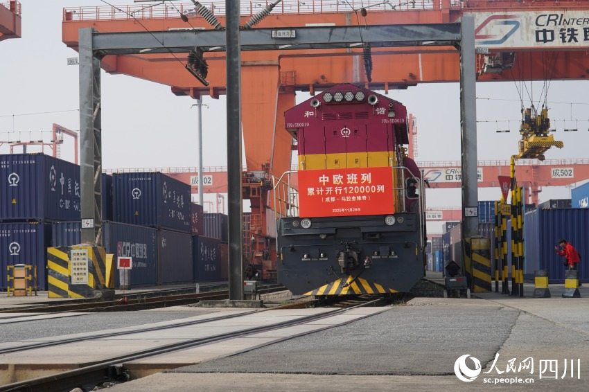 人民网成都11月28日电 (赵祖乐)11月28日12时13分,随着开往波兰马拉舍维奇的X8086次中欧班列从中国成都国际铁路港发车,中欧班列累计开行突破12万列,发送货值超4900亿美元。