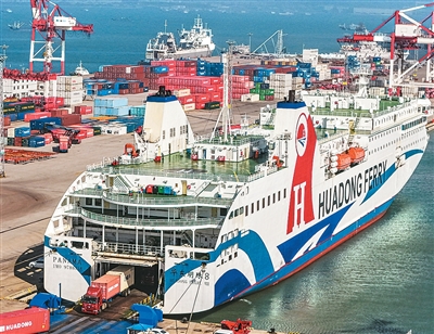 A foreign-owned passenger and cargo roll-on roll-off ship loads and unloads cargo at Shidao Xingang port in Rongcheng city, east China's Shandong Province, before the arrival of the "Double 11" shopping festival. (Photo/Li Xinjun)