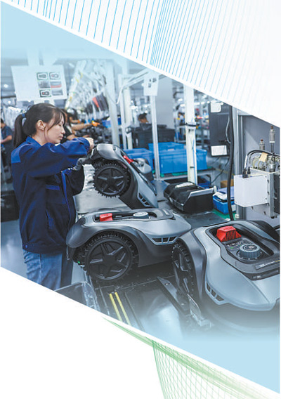 10月23日,浙江金华市金义新区的浙江白马科技有限公司生产车间,工人正在组装出口智能割草机器人。新华社记者 徐昱摄