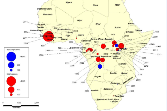 埃博拉出血热是由埃博拉病毒引起,病死率可高达90%,1976年首次发现于刚果(金)的埃博拉河地区。主要通过直接接触传播。直接接触病人的血液、分泌物等体液,接触尸体,接触受染猩猩、猕猴等动物时可传播。非洲部分地区有葬礼时亲吻死者习俗,参加葬礼为高危因素。埃博拉病毒最早于1976年在刚果(金)(旧称扎伊尔)北部的埃博拉河附近和苏丹同时被发现。主要流行于非洲中部、西部和东南部。重点国家包括刚果(金)、刚果(布)、乌干达、苏丹等。