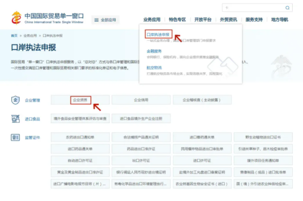 (二)点击上方“业务应用”—“口岸执法申报”,点击“企业资质”进入。