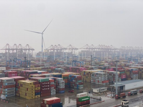 站在宁波北仑第三集装箱码头有限公司行政办公楼12楼的平台望去,冬日细雨中,宁波舟山港穿山港区连片的集装箱齐整堆放,更远处,万吨巨轮靠满泊位,巨型桥吊加紧装卸,作业忙碌而有序。