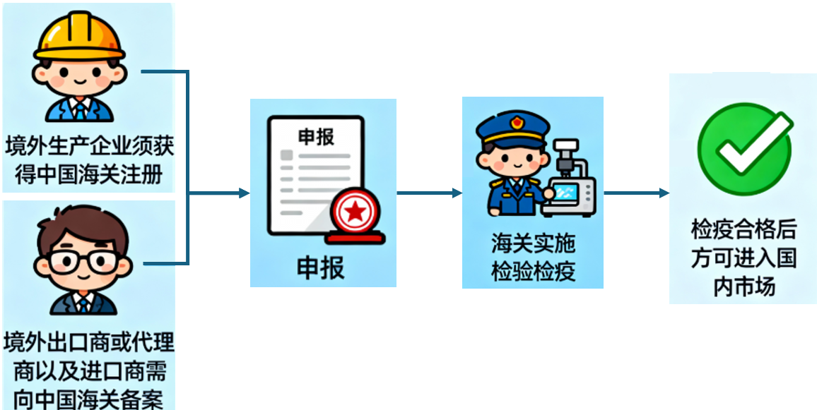 首先,境外生产企业须获得中国海关注册,产品的境外出口商或代理商以及境内进口商需向中国海关备案。进口商提交申报材料,海关实施检验检疫,合格评定通过后方可进入国内市场。