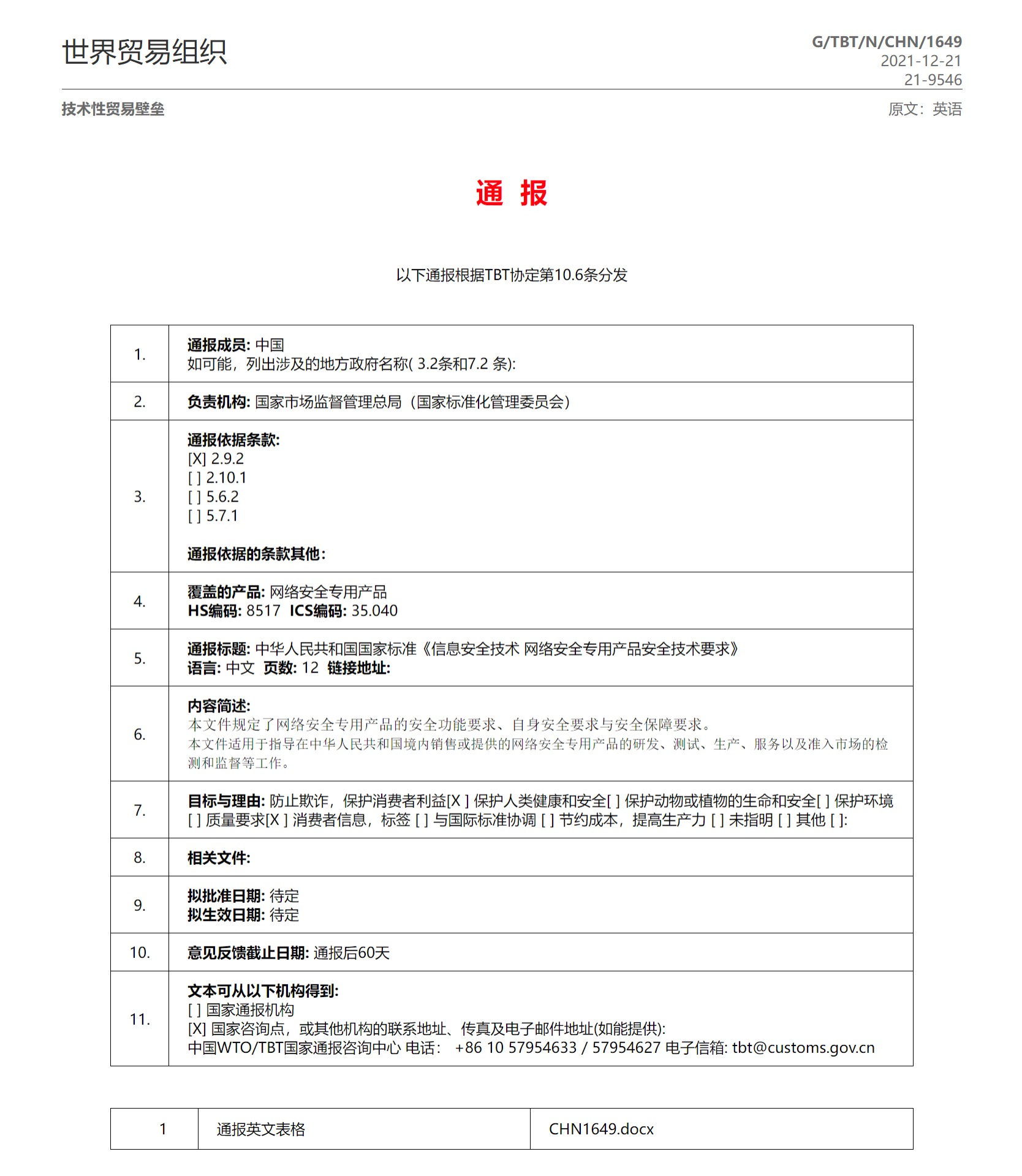 中华人民共和国国家标准《信息安全技术 网络安全专用产品安全技术要求》 G/TBT/N/CHN/1649