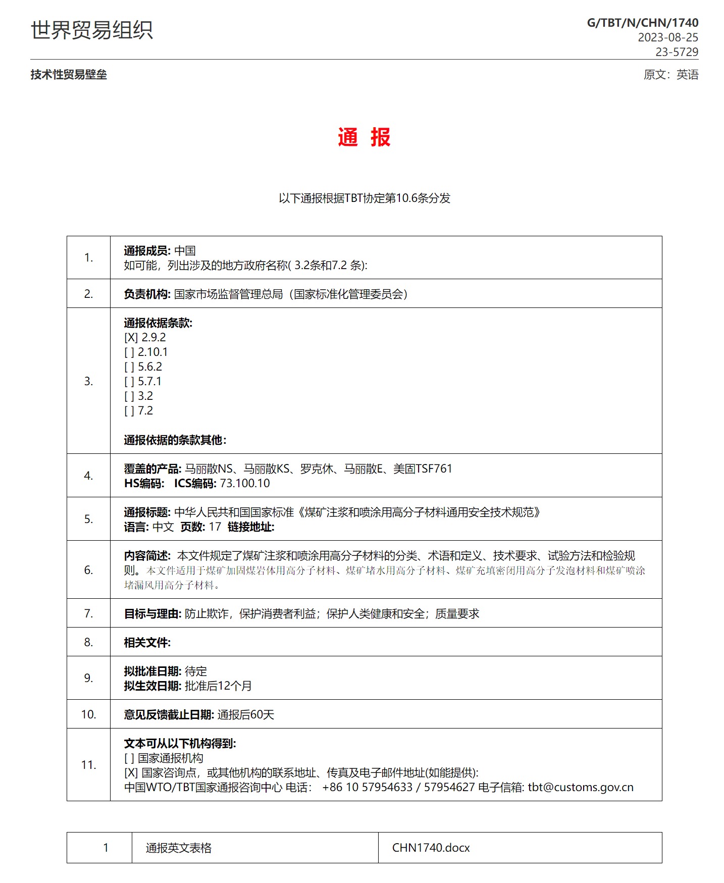 中华人民共和国国家标准《煤矿注浆和喷涂用高分子材料通用安全技术规范》G/TBT/N/CHN/1740