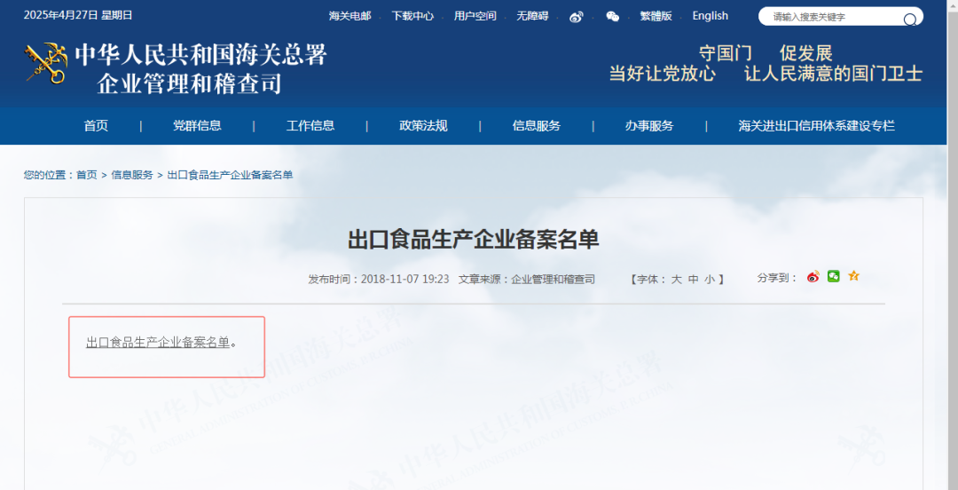 海关总署统一公布出口水产品原料养殖场备案信息。企业可通过海关总署企业管理和稽查司官网查询备案情况。