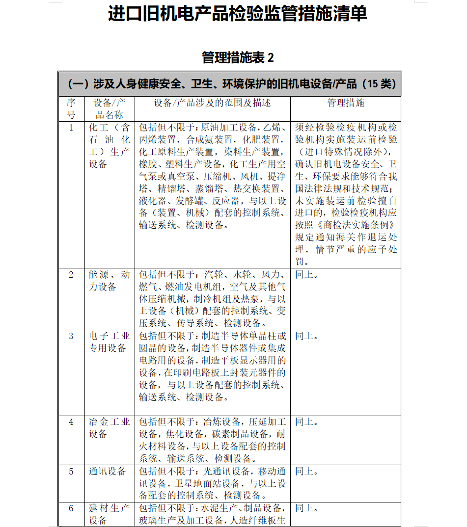 1.《质检总局关于调整进口旧机电产品检验监管的公告》(2014年第145号),对于列入《进口旧机电产品检验监管措施清单》管理措施表2的旧机电产品应实施装运前检验,共计17类旧机电产品。