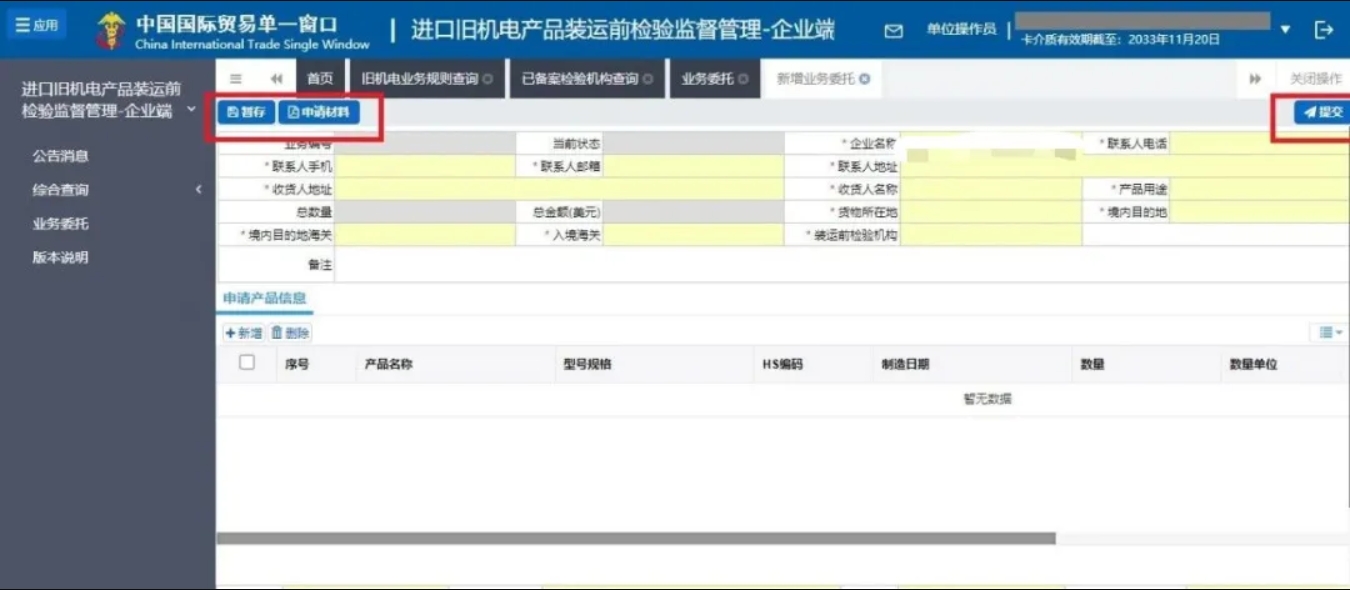 进入“中国国际贸易单一窗口”-全部应用—口岸执法申报-检验检疫-进口旧机电产品装运前检验监督管理-委托企业入口-业务管理-业务委托,点击“新增”按钮,进入“新增业务委托界面”,其中必填项以红色*标出。