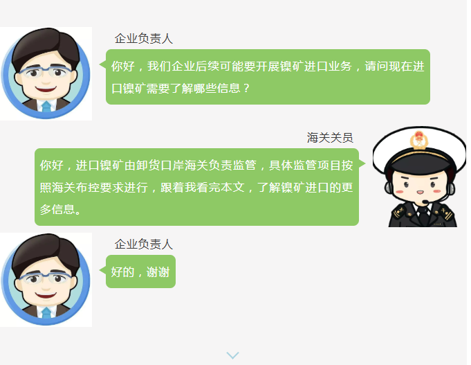 进口镍矿属于大宗资源性产品,受国内以及国际的相关政策影响较大,建议企业及时了解最新的进出口政策,防止或减少由此产生的经济损失。建议企业加强源头质量管控,具备条件的可以开展装运前检验,选择权威的第三方检验鉴定机构在国外装货港开展装运前检验,或直接指派国内检验机构赴装货地实施抽样或监督检验。企业如在进口镍矿过程中有任何疑问,请及时咨询当地海关。