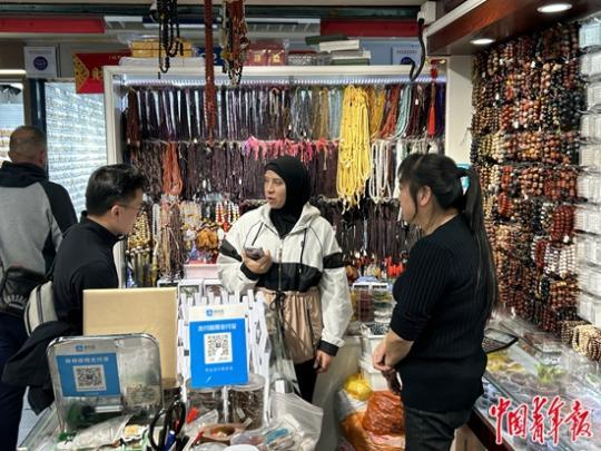一名外籍客商正在义乌国际商贸城的一家饰品店内选购商品