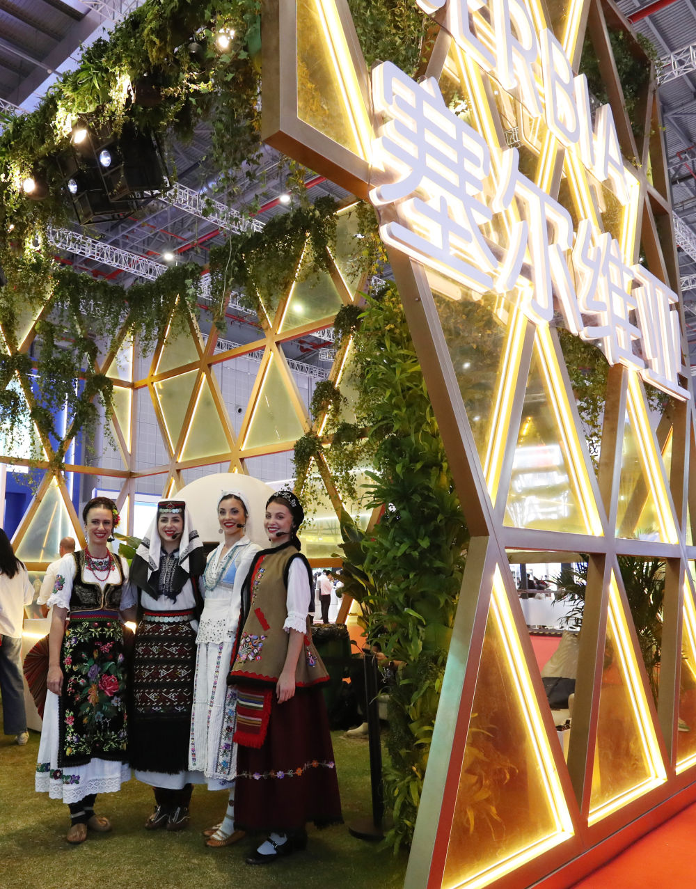 2023年11月6日,身着传统服饰的演职人员在上海进博会国家展塞尔维亚展台迎接参观者。第六届进博会国家展全面恢复线下举办,洪都拉斯、塞尔维亚、越南、南非、哈萨克斯坦作为本届进博会主宾国在国家展亮相