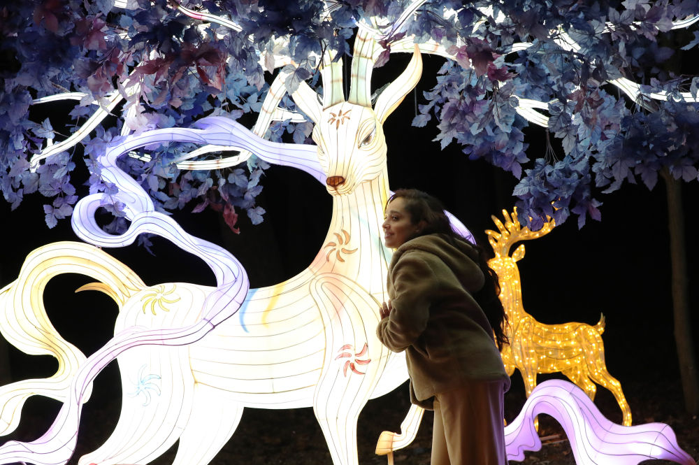 2023年12月14日,一名女子在法国巴黎风情园举办的“山海有灵”法国豫园灯会上拍照留念