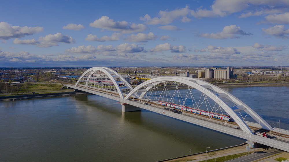 2024年3月12日,一列火车运行在匈塞铁路塞尔维亚境内贝诺段诺维萨德多瑙河大桥上(无人机照片)